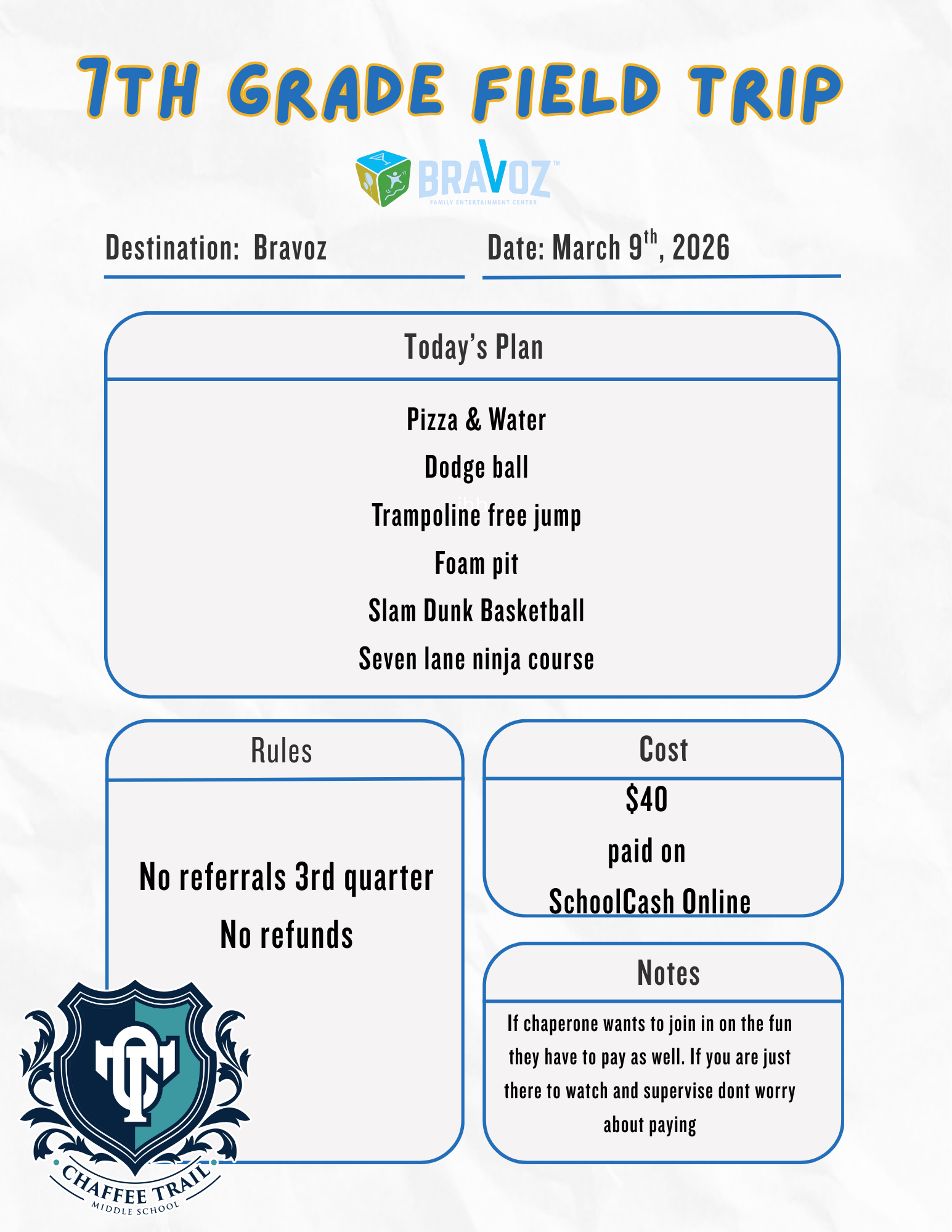 • $40 per student; due on Monday, 03/09/2026